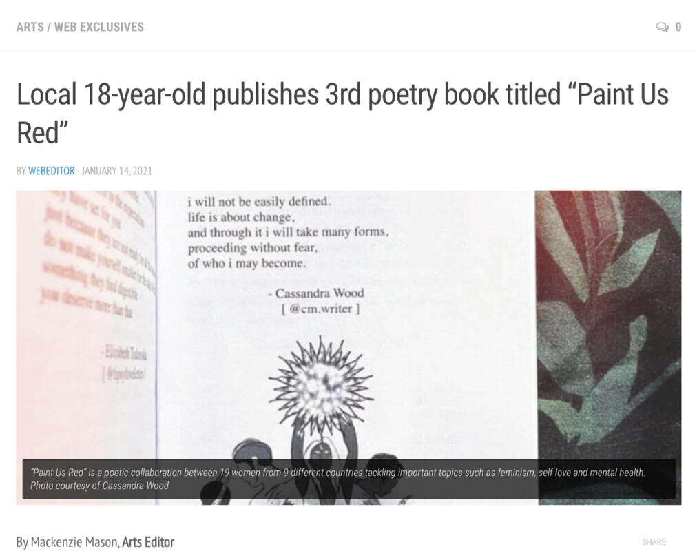 Caught red handed was a phrase first used in reference to people caught with blood on their hands from murder. To all the women, wrongfully marked, apprehended, blamed, accused, judged - let you be unafraid to become all that you are. Let us, as women, take back our worth, our belonging, our power. Let us name this movement: reclamation, PAINT US RED. Paint Us Red is an international poetry publication. It is a celebration of womanhood, a masterpiece of 200 pages, the words of 19 women from 9 countries.